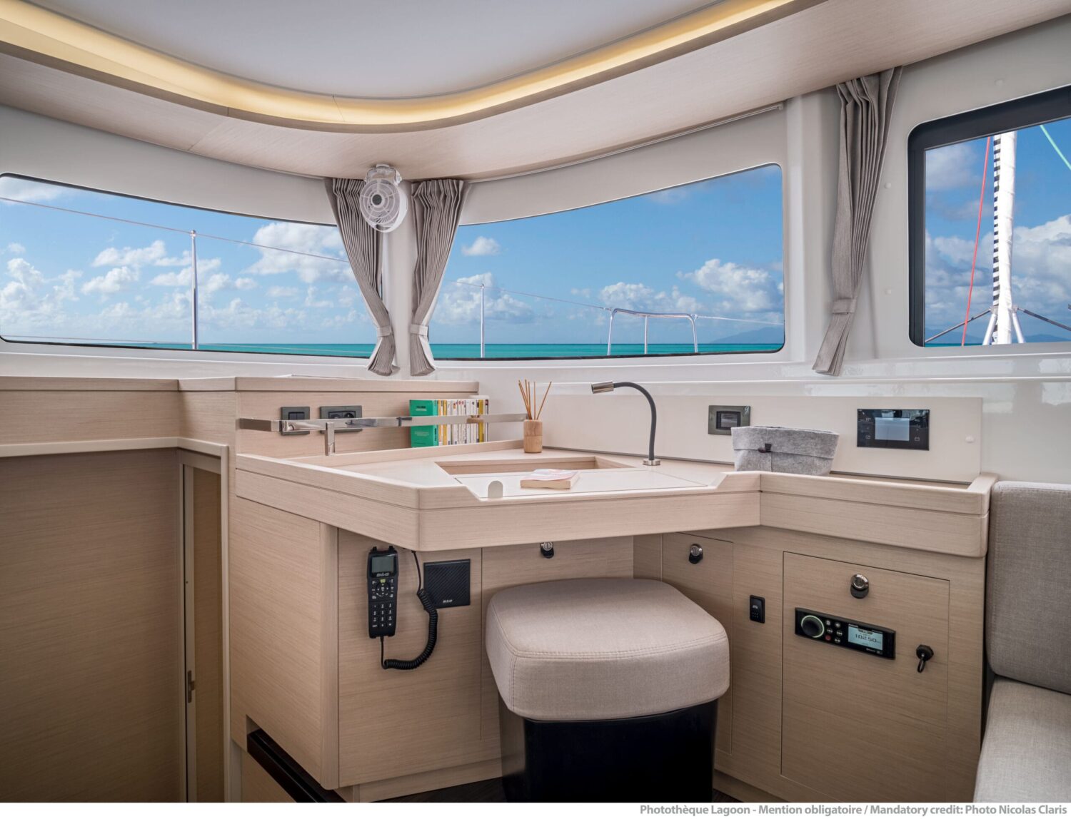 The hulls, designed by VPLP, offer a fine entry for performance while maintaining volume for comfort. Weight distribution is optimised for balance, and the elevated bridge deck ensures quiet, dry sailing across a range of conditions. A robust internal grid structure supports rigidity and durability over long passages.